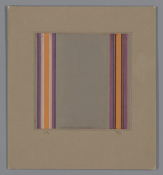 This is Dirk Verstraten’s 'Design for a carpet with vertical stripes,' and it looks like it was made with gouache. The surface of the central purple rectangle is so flat and opaque, like a big calm sea. Yet, when you look closer, you can see subtle brushstrokes, like the tide coming in and out. Then there are those stripey lines on either side. On the left, earthy reds and greys and on the right cool blues and blacks. Note that each set of lines is slightly different from the next. The imperfections, the little wobbles, give the whole thing a real human touch, like a funky, hand-woven textile. It reminds me of the work of Agnes Martin, especially in the way it uses color and line to create a sense of space and depth. Like Martin, Verstraten seems interested in the power of simple forms to evoke complex emotions and ideas. This design celebrates the beauty of imperfection, inviting us to embrace ambiguity and see the world in new ways.