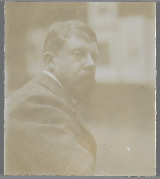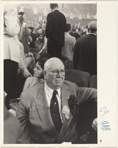 Curator: Ilse Bing captured this image, titled "Street Fair, Paris," in 1933, using the gelatin-silver print technique. It’s a fascinating window into Parisian life of the time. Editor: There's a stillness to it that belies the presumed energy of a street fair. It's more contemplative than celebratory, wouldn’t you say? Almost… cinematic. Curator: I think that reflects the influence of the New Vision movement, focusing on clarity and objectivity. Bing, as a prominent figure in avant-garde photography, was keen to capture a candid realism. Consider how the man's features and his place among a bustling crowd are rendered; even that cigarette hanging from his lips seems to speak volumes. Editor: Absolutely, and those eyeglasses --such potent signifiers of intellectualism. Is it just me, or is there something almost melancholic in his gaze? He seems both present and detached, framed by what must have been a clamorous scene, but entirely isolated. I wonder, who was this person, really? Curator: That's where it gets compelling. This image doesn’t offer the narrative closure we expect from portraiture; instead, we encounter a fragment, a slice of lived history. His hat and tie represent middle-class respectability but look more closely; the slightly disheveled tie is in stark contrast to his nice clothes. Editor: Yes, there is a fascinating disjunction there. It feels representative of the wider social complexities during the interwar years – the economic anxieties simmering beneath the surface. That little detail undermines the seeming social convention and conformity; quite clever of Bing, isn’t it? Curator: I'd agree, because photography in this time had to do double duty. Its aesthetic choices acted as a tool for understanding broader cultural shifts, political changes, and personal sentiments. Bing offers a narrative without ever telling it straight out. Editor: A visual poem rather than a story. This really changes my perception of what "street photography" is capable of. Instead of simple documenting, it's about decoding the hidden language of everyday life. Curator: Indeed, seeing this photo can allow one to look closer and understand cultural implications and its subjects. It really invites closer readings into Parisian life.