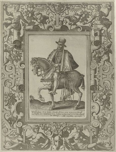 Abraham de Bruyn made this print, “Scythische ruiter,” whose dimensions are roughly 10 x 8 cm, sometime in the late 16th century. Notice first the stark contrast of the black lines against the off-white paper, giving it a crisp, graphic quality. The composition is dominated by a Scythian rider, centrally placed on horseback, holding a decapitated head—a trophy of conquest. The detailed rendering of the rider's clothing, the horse's musculature, and the gruesome head creates a visceral sense of texture. De Bruyn uses the visual language to convey a sense of power and barbarity that the artist and his audience may have associated with Scythian culture. The decorative border, filled with flora and fauna, creates a frame within a frame, drawing attention to the central scene. Consider the broader cultural context: the print engages with early modern European fascination and fear of cultures beyond their own borders. Ultimately, De Bruyn’s masterful use of line and composition invites us to contemplate the complexities of cultural representation and the narratives of power embedded within.