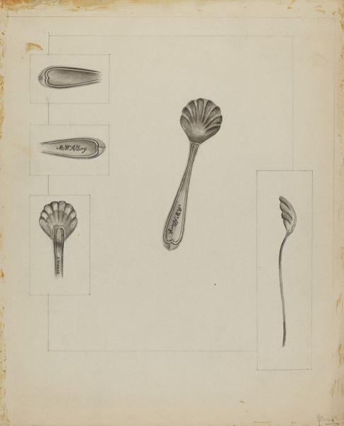 Curator: Here we have Anthony Zuccarello's "Silver Sugar Spoon," created around 1936. It's a detailed drawing using pencil. What strikes you first about it? Editor: It’s the interplay of light and shadow that catches my eye immediately. The artist's skill in capturing the reflective surface of the silver is remarkable. Notice how the form is built up through subtle gradations. Curator: And let's consider this in the context of the time. A drawing dedicated to something as everyday as a sugar spoon elevates the object, perhaps as part of a larger trend of design appreciation that took hold during the Art Deco period. Editor: It's not just the period; consider the shape. The scalloped bowl is elegant. How do those lines interact? And is the drawing a form of advertisement? The clean, uncluttered background emphasizes the precision of line. Curator: I see it more as a study, documenting and potentially celebrating craftmanship. The detail around the handle suggests an almost reverential approach to the act of creation and design, the artist capturing the essence of each curve with exacting detail. Look at the monograms. Do they reveal a specific client? Editor: The artist’s name and that little flourish certainly invite a closer look, drawing our eye across that delicate paper. Its material construction is vital to interpreting how the piece functions within this exhibition space. I can also make sense of the choices using formal analysis tools like structuralism. Curator: What I appreciate most is the implicit commentary on the materials of our everyday lives. That elevates it above a mere sketch. It is really quite nice. Editor: Precisely! A reminder that beauty can reside in the most humble of objects. Thank you for pointing that out!