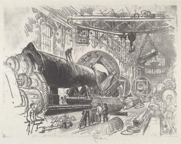 Editor: Here we have Joseph Pennell's 1916 engraving, "The Gun Shop." The sheer number of cannons creates a really overwhelming, almost oppressive atmosphere. What social commentary do you see in this piece? Curator: Oppressive is a key word. I see a stark visual representation of the military-industrial complex taking shape during World War I. It's not just about making weapons; it's about normalizing and even celebrating industrial-scale death. Consider who benefits from this image? What are the gendered implications here, when predominantly men are engaged in the business of manufacturing arms? Editor: So, you're suggesting the print does more than just document the manufacturing process? Curator: Precisely. It's implicated within a network of power structures. Who are these cannons for? Who is dying? The work acts as a site where nationalism, industrialism and violence intersect, reflecting on the mass dehumanization happening. Editor: I hadn’t considered the human cost as directly related to this factory. I see them simply producing material goods, rather than impacting social injustice. What can this reveal about gender roles, also? Curator: The traditional association of masculinity with warfare is unavoidable here, but the print itself encourages us to interrogate such links. It seems almost like a stage for gender performativity. If men create tools of war, does this automatically solidify their place as protector? In doing so, does the factory actively exclude those outside the circle of influence and power? It provokes critical thinking about masculinity, labor, and global conflict. Editor: That completely shifts my perspective. I was initially just focused on the aesthetic qualities and now I’m really aware of all the complicated social issues. Curator: Exactly. Art doesn't exist in a vacuum, and through contextual analysis, we understand it to critique and understand society's deeper contradictions.