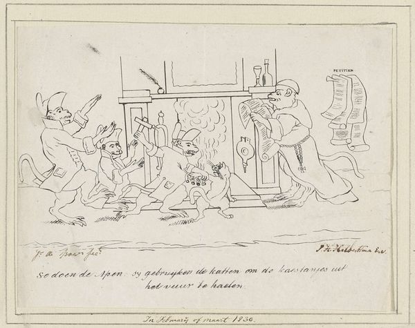 Curator: This pen and ink drawing, a caricature of Louis de Potter from 1828-1830 by J. de Boer, is rather striking in its depiction. The artist seems to equate the figures of authority to monkeys who are scrambling to pull chestnuts out of a fire. Editor: Yes, that's "Spotprent op Louis de Potter", created with pen and ink between 1828 and 1830. What immediately jumps out at me is its simplicity. I mean, the medium itself - humble pen and ink - seems crucial to the overall message. How does the material itself contribute to its meaning here? Curator: That's a very insightful observation. The choice of a simple, readily available material like pen and ink, lends itself to mass production and distribution of these satirical images. The accessibility of the medium speaks volumes about the intention behind the work. Think about the social context: printed images circulated widely, becoming powerful tools of political discourse. Editor: So, it's about accessibility, reaching a wider audience through more common materials, which empowers the artwork. That challenges the notion of preciousness we sometimes associate with art, doesn’t it? It feels deliberately… populist. Curator: Precisely! Consider the labor involved. Ink drawings could be easily reproduced, making it possible for more people to engage with these political commentaries. Are they active participants through their engagement of it, or complicit because they are being persuaded by the political statement? Editor: I guess it would depend on how people choose to receive and interpret the work! I learned that the very act of making art – from choice of medium to ease of reproduction – is inherently intertwined with social commentary. Curator: Indeed. By examining the material conditions of its creation, we unlock a deeper understanding of its purpose and impact. It definitely offers a stark contrast to the portraiture and landscape pieces that fill this museum, for sure.