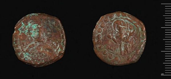 Curator: Immediately, I see the weight of time and empire etched onto this small surface; the marks of history are so powerful. Editor: Indeed. This coin, issued by the Byzantine Empire, speaks volumes about power dynamics, trade, and the everyday lives of people long gone. Curator: The symbols are incredibly worn, but hints of imperial figures remain, suggesting authority and divine right. It’s like holding a whisper of a lost world. Editor: I wonder about the hands it passed through, the transactions it facilitated. It's a potent reminder of how currency has shaped social structures across millennia. Curator: What resonates most is the unbroken chain of symbolic language. Images, even in worn form, persist in their power to communicate across centuries. Editor: Absolutely. And it's imperative to remember that these empires weren't monolithic. Who benefited and who suffered under its sway? That's what I think about. Curator: I'm left pondering how this tiny object carries such enormous cultural and historical weight. Editor: And how its legacy, for better or worse, continues to shape our present.