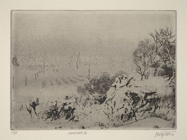 Lionel Lindsay created "The Shanty on the Rise" as a drypoint on paper. It reflects a deeply personal connection to the Australian landscape and the lives of its rural inhabitants. Through the visual language of the print, the viewer is invited to consider the intersection of class, labor, and belonging in early 20th-century Australia. The shanty, a rudimentary dwelling, stands as a symbol of both resilience and marginalization of the working class. Lindsay’s choice to depict the workers from behind, their faces obscured, suggests a focus on their collective identity as laborers rather than individual portraits. The presence of the dog, a common motif in depictions of rural life, adds a layer of emotional depth, symbolizing loyalty and companionship in a harsh environment. The date inscribed on the print situates it within a specific historical moment, inviting reflection on the economic and social conditions of the time. It captures a moment of quiet determination, mirroring the broader narratives of nationhood and identity.