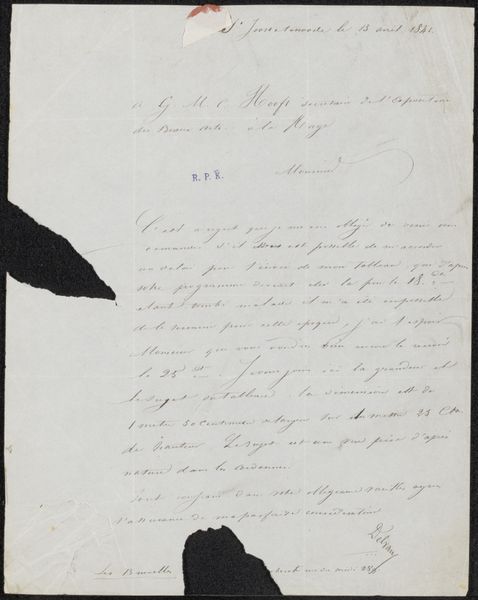 Editor: Here we have “Brief aan Reinier Craeyvanger,” or “Letter to Reinier Craeyvanger,” created sometime between 1842 and 1849, by Pierre Louis Dubourcq. It's ink on paper and lives here at the Rijksmuseum. My first impression is... well, it just *looks* like an old letter, slightly faded, a little formal maybe. What's your read on it? Curator: It whispers of another time, doesn’t it? Imagine, if you will, the weight of words when they were painstakingly crafted by hand. The loop of the ‘d’ in Amsterdam, almost a flourish, eh? This letter provides an intimate glimpse into the art world of the mid-19th century in the Netherlands. Letters were a critical means of networking and patronage in those days! Editor: So, less about visual artistry and more about historical context then? Curator: Not exclusively! The very act of handwriting was an art, and the composition of the letter – its neatness, the flow of the ink – reflected the writer’s persona, no? It's almost a dance between the personal and professional. The neat lines suggest organization but observe how the ink fades and bleeds with age, imparting a wistful mood. You get the feeling this writer was very aware of how his missives could affect how others saw him! The placement of words, the penmanship itself - all considered. What do *you* imagine, based on its composition, that the intent behind this letter might have been? Editor: Good point! Perhaps to give the recipient an impression of scholarly work? It certainly worked on me at first! Curator: Precisely! It also seems Dubourcq used letter-writing for something other than communication. We're seeing, at the end, an initial design idea with calculations and mathematical concepts on it. Letter, message, notation, and even an accounting ledger: these multiple identities exist within a single item. So it all becomes one with itself. Now there’s a thought for today's fast world. Editor: Wow, I would have missed so much of that! Thanks, that’s a real shift in my perspective.