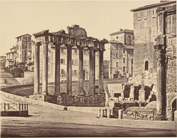 Editor: This is "Rovine del Foro," a photograph by Eugène Constant, taken sometime between 1848 and 1852. What strikes me immediately is how still and monumental everything feels, almost like a stage set for a forgotten drama. It's grand but somehow melancholy. What do you see in it? Curator: I feel that melancholy too. It whispers of time’s relentless passage. Eugène Constant has captured Rome’s essence - a city layered with history. I am immediately drawn to the pillars; they frame the story of Roman glory juxtaposed with encroaching modernity. It’s more than just architecture, isn’t it? What feelings does the ruin evoke? Editor: Definitely, it's the contrast. The foreground is so earthy and disrupted, and then your eye travels up to these enduring, almost defiant, classical forms. Curator: Precisely! See how Constant used light and shadow. Notice the buildings beyond the pillars: they almost seem ghostly compared to the sharp stone. What do you think he was aiming to say about history's persistence and vulnerability through that contrast? Editor: I guess, maybe that even in ruins, the past casts a long shadow on the present, and it will inevitably succumb to the passage of time. Curator: Beautifully put. And that makes me reflect… How will our time be seen in centuries to come? Perhaps in crumbling structures and fading photographs… a thought. Anything that stands out to you about Constant's technique in creating these tonal effects? Editor: I suppose given the date, this early experiment in photography would be challenging technically. Curator: Exactly! He was painting with light, forging a vision of Rome that’s both a document and a poetic statement. Thank you for helping me think through the vision.