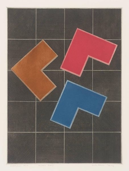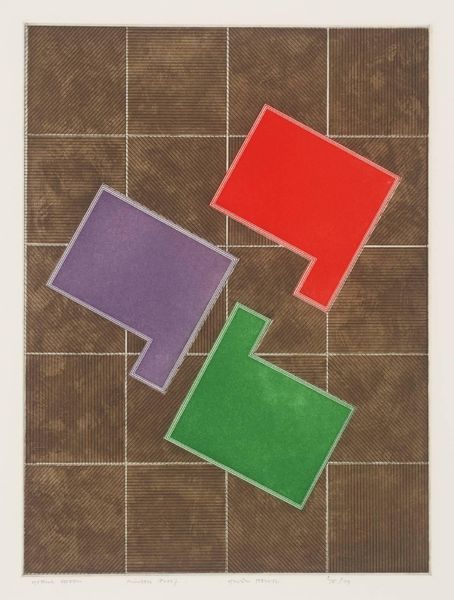 Curator: Immediately striking—the forms feel almost like pieces on a game board, poised mid-move. Editor: Indeed. This untitled print by Gordon House, dating from an unknown year, presents a compelling study in geometric abstraction. Curator: I’m drawn to the interplay of textures: the gridded background against the solid, primary-colored shapes. What does this contrast evoke for you? Editor: The 'game board' matrix evokes, for me, a field upon which ideological battles are waged. The shapes, abstracted as they are, hint at codified symbols. Curator: An intriguing reading. I appreciate the compositional balance achieved through the arrangement of the forms, creating a sense of dynamic equilibrium. Editor: Yet that equilibrium feels deceptive, doesn't it? Those colorful, displaced shapes suggest a more critical commentary on order versus disruption. Curator: Perhaps. Ultimately, it's the viewer who must resolve these ambiguities. Editor: Precisely, and perhaps use those ambiguities to reflect upon the systems that shape our own lives.