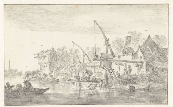 Curator: This drawing is titled "Christ Preaching from a Boat" and comes to us from Esaias van de Velde, circa 1630. Editor: It has a wonderfully melancholic feeling to it. A bit ghostly, actually. The gray wash really contributes to that, doesn't it? It’s reminiscent of twilight. Curator: It's executed in pen, pencil, and brown ink on paper. We can see van de Velde meticulously captured the architectural details on the left, next to a large group of townspeople and Christ on the water. How might the setting—and this emphasis on place—shape the narrative here? Editor: Well, the architectural decay seems crucial. Consider the history and potential symbolism; Is this simply part of the material realities, or are we witnessing the literal "old order" being questioned by these nascent and progressive ideologies in early modern Europe? What if the work represents a deeper commentary on shifts in power and belief? Curator: Indeed. I'm struck by how much emphasis is given to depicting the modes of transit. Everyone here seems to have arrived by boat or has tools used for transport of goods and labor nearby. Editor: I am very moved by the ways the landscape seems so integrated into this narrative. The landscape of spirituality, the land, literally and metaphorically worked and changed in ways that mirror their culture and community. The image presents a figure speaking not to a mass of supplicants inside a church, but engaging with everyday workers at the water's edge, quite close to their trades. What is it saying about our relationship to power? Curator: The integration you mentioned creates an intimate, almost casual dynamic—but this integration of the human figure with daily trades and work also speaks to broader concerns about production in early modern Northern Europe. Van de Velde is showing us not just Christ, but an entire society engaged in the very literal act of listening—almost "consuming"—knowledge in their local environments. Editor: It also feels important to emphasize van de Velde's positioning of a non-elite public within a scene featuring such a venerated and mythologized figure. To whom is the artist giving visibility and presence here, and how are social narratives possibly challenged by it? Curator: Absolutely. It really does re-contextualize the traditional Biblical scene, making us rethink labor's role in accessing spirituality. Editor: What an insightful reconsideration of landscape, class, and scripture all in a small pencil and ink drawing. Curator: Yes, I agree.