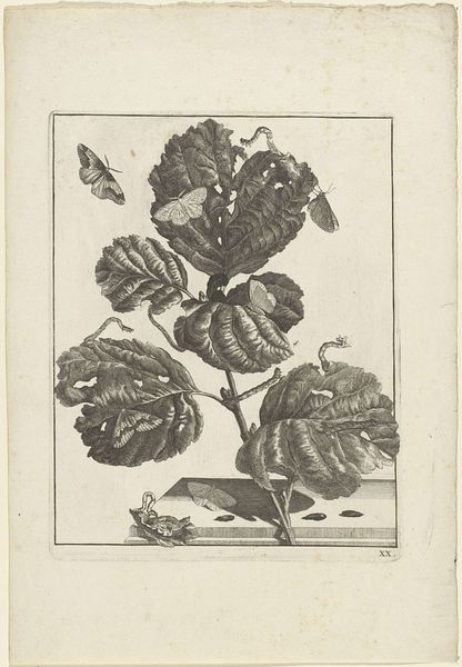 Jacob l'Admiral created this print, "Flying butterflies and other insects above a branch with leaves" using etching. The composition immediately draws us into a world meticulously rendered in monochrome. Admiral masterfully uses line and texture to distinguish the various natural forms. We can see clusters of leaves, each carefully etched to display a network of veins and textures. Above, three butterflies are suspended in mid-air, rendered with a graphic sensibility, their wings spread in symmetrical patterns. What strikes me is the structural interplay between the detailed representation of the flora and fauna and the flat, almost diagrammatic style of the insects. The composition creates a tension between scientific observation and symbolic representation, blurring the lines between naturalism and abstraction. It invites us to decode the semiotic relationship between the image's components, encouraging a reconsideration of the boundaries between art and science, observation and interpretation. It’s a piece that challenges our perceptions and destabilizes fixed meanings.
