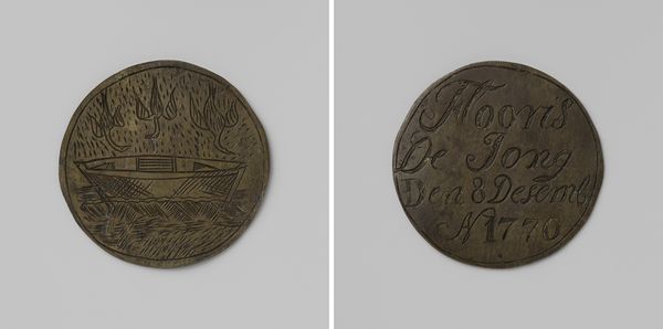 Editor: This striking metal piece is a guild penny from 1778 by Bernardus Koster. It represents the Amsterdam Guild of Grain Measurers and Loaders. I’m struck by the amount of detail on something so small. What can you tell us about this work? Curator: This penny offers a glimpse into the social structure of 18th-century Amsterdam. Guilds like this one were crucial, acting not only as trade associations but also as social and political bodies. Can you see how the imagery, even on a small scale, reinforces their power and importance? Editor: I do, it seems almost like propaganda because it shows how integral their structure is, and that this tiny token actually served as something that reflected broader socio-economic power. The detail on the building depicted on the coin really speaks to that. Curator: Exactly. This coin wasn’t just a payment; it was a symbol of belonging and legitimacy. Notice the architectural detail, too. What kind of message might the artists be conveying here through that architecture? Is it trying to emulate the scale and details of their workplace? Editor: Perhaps it was about reminding people of the guild's authority by presenting itself as something grand. I never thought I could look at currency with a lens of social standing and representation. Curator: It’s a reminder that art, in all its forms, reflects the power dynamics and values of its time. Consider how similar tokens or symbols function in contemporary society; who controls them, and what do they represent? Editor: That's so interesting, now I want to research contemporary parallels, and what those parallels imply about society today. Thank you! Curator: Indeed, this penny makes you consider currency and the visual messaging. I learned new insights today.