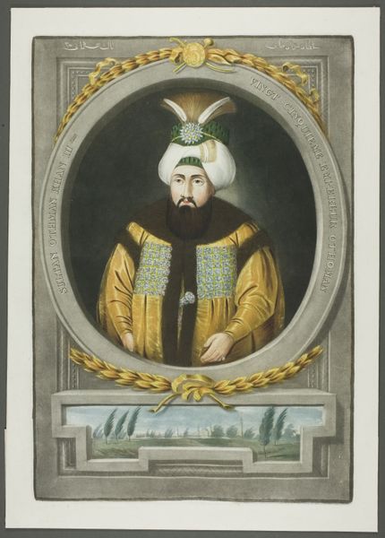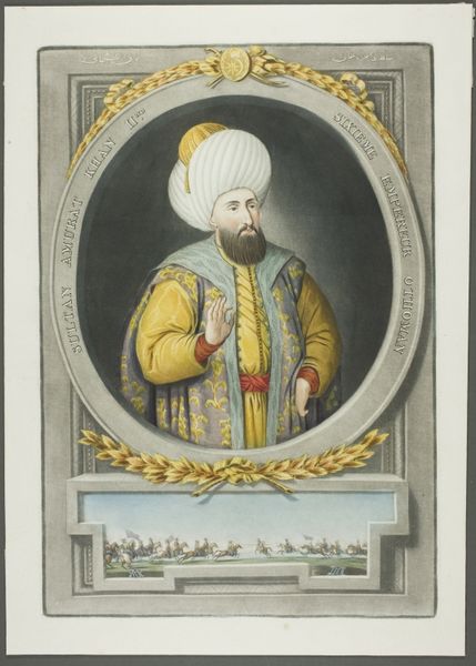 Editor: This striking image seems plucked right from the pages of "One Thousand and One Nights"—what exactly are we looking at? Curator: Indeed! This chromolithograph, titled "Cimeter," hails from the "Arms of All Nations" series produced in 1887 by Allen & Ginter Cigarettes. Editor: Even printed on this scale, the composition really jumps out. The artist uses bright primary hues to create a strong graphic presence, while simultaneously allowing more subdued geometric patterns to function in the background. It’s quite lively and eye-catching. Curator: It's fascinating to consider the intent behind such a piece, given the rise of orientalism at the time. The figure, clearly intended to represent a character of Middle Eastern origin, grasps a distinctive scimitar. These swords symbolized power, honor, and skill in many Eastern cultures, a visual shorthand for the "exotic East". Editor: You know, there’s also a possible parallel with contemporary understandings of branding. Cigarette companies often used such images to lend their brands an air of sophistication and worldliness, promising a sort of vicarious adventure to the smoker. It also reinforced contemporary Western cultural biases regarding the exotic “other.” Curator: Absolutely. Notice, too, the turban. This is far from just a simple head covering. It signified social status, religious affiliation, and even tribal identity in the Ottoman Empire. To the consumer, it reads more as cultural "costume" than a symbol of deep social meaning. Editor: But it all feels so flat, despite its vibrancy, like a theater backdrop instead of a lived-in space. The image thus presents this "other" culture, but keeps it safely at a distance for its consumers. The technique is at odds with the narrative content. Curator: That push-pull is telling, isn’t it? The romanticized presentation served a purpose, exoticizing the subject for profit and playing into the imperial mindset so common in the period. Editor: I suppose we see a reflection of consumer culture embedded within this type of ephemera: desires, biases, marketing all swirl together within a single print. Curator: Precisely. It’s a concentrated lens onto a specific moment in time.