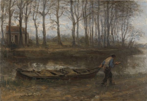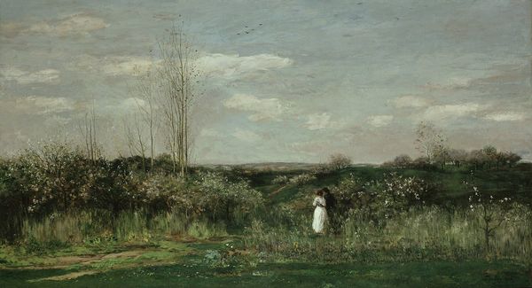 Editor: We're looking at Camille Corot's "Fermière agenouillée cueillant des pissenlits," or "Kneeling Farm Woman Picking Dandelions," painted around 1865. It’s an oil sketch, almost a fleeting moment captured en plein air. The mood is gentle, almost melancholic. What do you see in this piece that I might be missing? Curator: Missing? Never! More like, what other whispers can we coax from the canvas? For me, this isn't just a painting; it's a sensory poem. Can you almost smell the damp earth, hear the faint buzz of insects around the dandelions? Corot wasn't just painting a woman; he was painting the quiet intimacy between her and the land. Doesn't it remind you of simpler times when nature's pace dictated our days? What strikes you about Corot's use of light? Editor: It's very soft, diffused. It softens the edges of everything, which contributes to that feeling of intimacy you described. Is this softness typical of Corot, or is it something he developed later in his career? Curator: Precisely! And yes, this hazy, dreamlike quality, what some called his "souvenir paintings," became a hallmark. Later in life, he prioritized feeling over sharp detail, favoring atmospheric effects and tonal harmony. Imagine him, perhaps a little wistful, painting from memory, layering emotion into every brushstroke. What kind of stories might this woman have to tell, do you think? Editor: Probably a life connected to the land, deeply rooted. A cyclical life of seasons, sowing, and harvesting. This really feels like a moment suspended in time. Curator: And in our own time now, we briefly connect to it. Thanks for bringing your fresh, open eyes to it. Editor: It was so cool to reconsider the painting this way. Thank you!