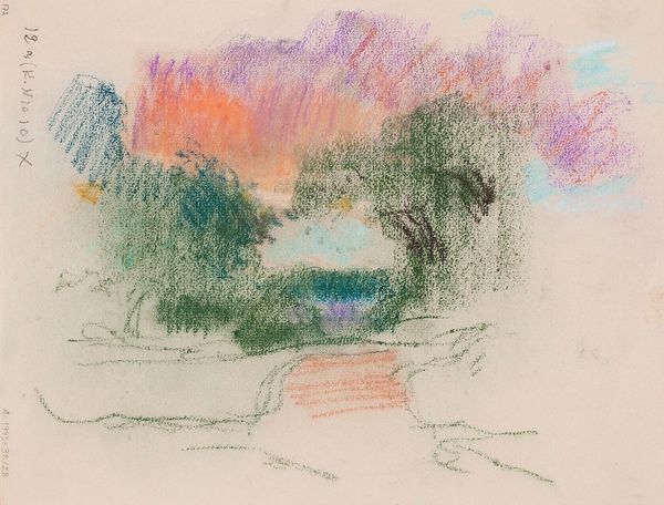 Curator: Magnus Enckell’s "Maisema," created in 1912, draws us into a pastel landscape shimmering with Neo-Impressionist and Symbolist sensibilities. What catches your eye? Editor: Initially, the chromatic intensity. There’s a dreamlike haze to the entire composition, created by these overlapping pastel strokes, that feels otherworldly. The house, if that's what it is, almost seems to float. Curator: I’m interested in how the dreaminess you note intertwines with broader currents in early 20th-century Finland. Enckell was a key figure in bringing European modernism to Finnish art, advocating for art that explored the psyche, that challenged established social and artistic norms. Do you think the artwork embodies this kind of psychological confrontation? Editor: Absolutely. The image contains elements that appear unstable. Look at the weeping branches and fragmented structure. Are those boats to the side or only suggestions of vessels? Everything dissolves in your peripheral vision, demanding further inspection, so in that way it reminds me of the precarious nature of life during periods of social transformation. Curator: It seems the use of pastel underscores Enckell's intentions. A medium prized for its softness and delicacy, it enables him to depict the landscape with an ethereal quality, far from any kind of pure naturalism. Consider how this contrasts with the realist traditions then prevailing. Editor: Indeed. These blues, greens, and yellows create such interesting textures. I see what seems like water indicated by these linear and fluid strokes, almost like stylized wave motifs from traditional maritime cultures. Perhaps it's indicative of constant change and the passage of time. Curator: And doesn’t that sense of transience beautifully capture the Symbolist goal of reaching beyond the tangible to reveal unseen emotional and psychological states? Enckell positions us, as viewers, in that liminal space. Editor: I agree. Through an aesthetic rooted in exploring emotion and visual metaphor, the symbols invite the viewer to contemplate existence and their inner worlds. Thank you. Curator: A compelling landscape that uses layered strokes to speak volumes. Thank you.