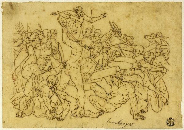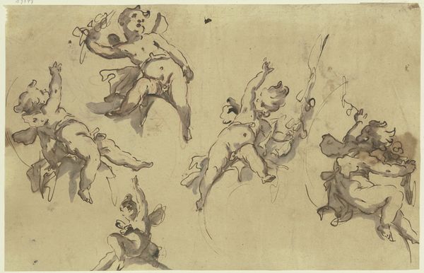 Micco Spadaro made this pen and brown ink drawing, Studies of a Group of Seated Figures and of a Flying Figure, in Naples, Italy, in the mid-seventeenth century. It appears to be preparatory sketches for a larger work, perhaps a history painting or an altarpiece. In this period, the institutions of the church and the aristocracy exerted enormous influence on artistic production in Naples. Spadaro's image employs visual codes drawn from classical antiquity and Christian iconography. We see seated figures draped in classical robes, and floating figures that might be angels or allegorical personifications. These are all typical features of Baroque art, which served to reinforce the power and authority of the ruling elite. To better understand Spadaro's drawing, we might research the patronage networks and artistic academies that shaped his career. We can also analyze the broader social and political context of Naples in the 17th century, a time of upheaval and transformation, to consider the meaning of art as something contingent on historical context.