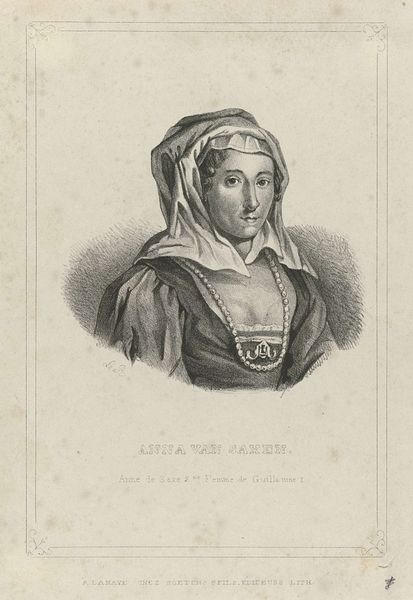 Curator: Looking at this lithograph, "Gertrud Rask," created in 1876 by Lars Møller, housed here at the SMK, I'm immediately struck by its formal qualities. It embodies 19th-century portrait conventions while also reflecting a very specific social milieu. What do you see? Editor: Oh, wow. First impression? Serenity, I guess. She has these calm, knowing eyes. Like she's seen a thing or two and decided to keep it classy. And that elaborate bonnet… it feels like a world unto itself. There's almost a graphic novel vibe to this portrait. It has this simple comic-book quality. It really has personality! Curator: It's fascinating to consider how Møller uses graphite and lithography together. There is a certain level of realism for portraits produced for this purpose. Lithographs allowed for relatively easy reproduction and distribution, solidifying visual narratives about specific individuals or societal types within the era. Editor: Exactly! You get the sense of wanting to understand the subject more. Gertrud’s expression does tell some part of her, you just don’t know exactly what. Is she sad, melancholic, empowered, or maybe resigned? And technically, this drawing isn't just representing Gertrud, it’s doing a specific kind of labor of showing an idealized version for future viewers and admirers to enjoy. Curator: This image is likely based on other drawings done by the same author, who might have tried to elevate this person within the imaginary of her time. Perhaps an attempt to represent her with elegance to secure her status. Also notice the gaze she offers—it projects both strength and consideration. How might this interplay challenge notions of historical femininity or status? Editor: Hmmm, interesting point about challenging status. I wonder if she actually liked that bonnet. Perhaps it's more of a social straightjacket than anything else. It confines the female figure. On second thought, all of that lace surrounding her neck feels kind of heavy. I am so curious about how people perceive themselves within the fashions and norms of the time. How did these things shape one’s sense of identity? Curator: Exactly. Considering the societal conventions during the late 19th century, particularly concerning gender roles and public representation, there is always tension with art. This portrait captures a particular kind of balance—between idealization, realistic character and status. What lasting impact could visual representations like “Gertrud Rask” have? Editor: Well, for me, it's that sense of quiet dignity amid all the artifice of her dress and station. That stays with you. There is more here than it might seem at first glance. And just for that, it makes me keep thinking about how society dictates some paths. Curator: Agreed. It’s a layered and nuanced image, provoking dialogue even after so many years, reflecting the complicated visual culture it occupied and actively participated in.