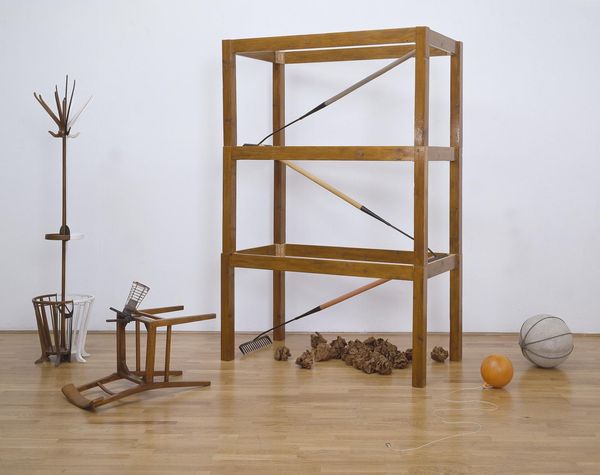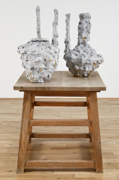 Curator: Standing before us is Andrew Lord's piece, aptly named "breathing." Editor: My first thought is that it feels like a still life, but with an almost unsettling, organic quality. Curator: Lord, born in 1950, is known for his sculptural ceramics that often play with form and function. Consider the placement of the work, upon this rough-hewn table. It lends a deliberately provisional quality. Editor: Yes, it’s the provisional aspect that fascinates me—the potential for these objects to be seen as embodiments of a transformative act. The glazing, for example, recalls traditions and perhaps parodies them. There is an irony here. Curator: I agree. It calls into question the traditional canon and asks us to reconsider the role of ceramics within the established hierarchy of art. Editor: Absolutely, and the title, "breathing," suggests an ongoing process, a resistance to fixity, a critical comment on the commodification of even the most radical artistic gestures. Curator: A fascinating commentary on the shifting dynamics of art and its place in our world. Editor: Indeed, it gives you much to consider about objecthood and time.