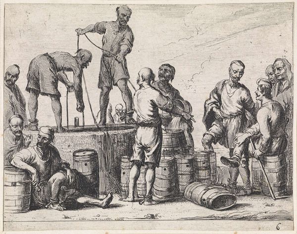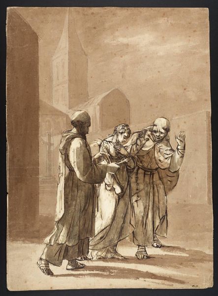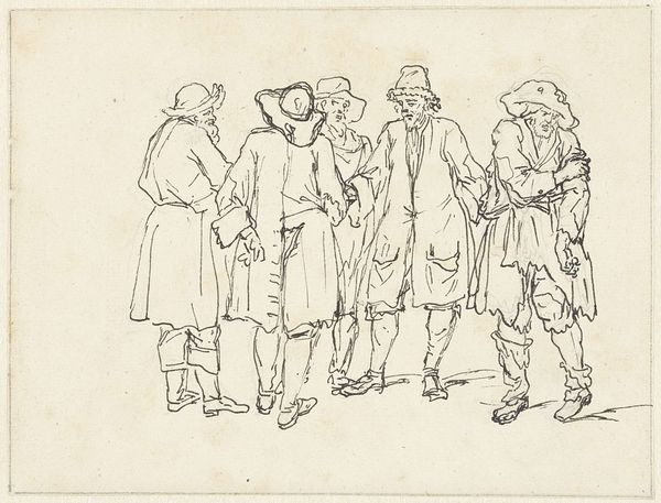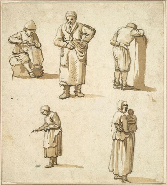 Editor: Here we have Willem van de Velde the Elder’s "Studies of Five Figures," a pen and brown ink drawing. I find it so interesting how he captures these figures with such economy of line. What do you find most compelling about this sketch? Curator: It is captivating, isn’t it? Van de Velde's ability to imbue these figures with such personality through such simple lines is masterful. I wonder what stories he imagined for each of them? They feel like characters in a play, don’t they? Editor: They really do! It’s amazing how a few strokes can suggest so much. Curator: Indeed! Van de Velde wasn't just documenting; he was breathing life into these figures. I find myself pondering their journeys. Editor: I'll definitely be looking at sketches with new eyes now. Curator: That's the magic of art, isn't it? Shifting perspectives, revealing hidden worlds.