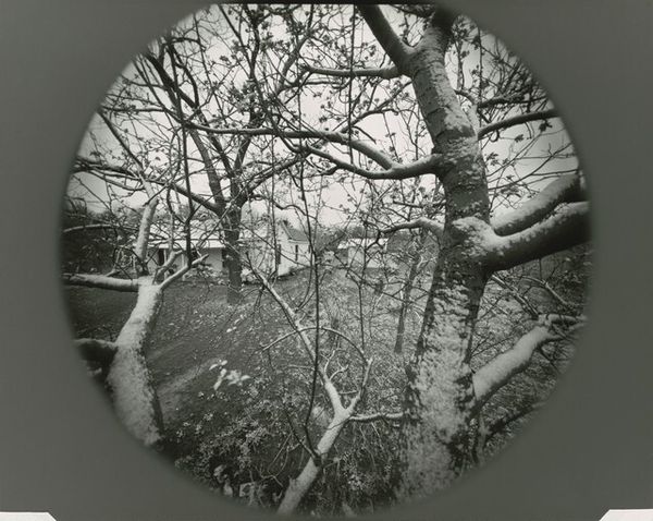 Curator: Before us hangs "Eleanor, Chicago," a gelatin-silver print crafted around 1952 by the masterful Harry Callahan. It layers portraiture within cityscape, which makes a pretty arresting introduction. Editor: Arresting indeed. My immediate sense is one of ethereal melancholia, like a ghostly echo caught between seasons. The monochrome palette emphasizes the stark beauty of the bare trees, making Eleanor seem almost like a dryad emerging from the urban woods. Curator: I find it deeply evocative of memory. Callahan photographed his wife, Eleanor, repeatedly throughout his career, often embedding her within the landscapes they inhabited. The overlapping images speak volumes; it suggests that we are less isolated than we think, our identities invariably intertwined with environments we create. Editor: Layering. A powerful symbolic act, indeed! Circles are central, recurring visual motif for protection and boundaries—and then we find ourselves back at trees again which link heaven to earth! Perhaps that is how she served him in those moments... Did she keep him grounded? Or inspire him to greater creative heights? Curator: Perhaps a little bit of both? What's so compelling to me is Callahan’s embrace of the seemingly mundane—family, urban landscapes. It's not dramatic subject matter but he finds the profound within these quotidian spaces. Editor: Precisely! These works capture what Gaston Bachelard called "the poetics of space." Callahan uses his home to express some hidden, inner state, transmuting a specific human figure into some kind of universal essence, all rendered by stark grayscale. How's that for symbolism?! Curator: It also reveals Callahan's experimentation. He manipulated light, exposure, and layering—a precursor, almost, to digital manipulation techniques available today. So, his images retain an undeniably timeless feel even across these many years. Editor: Ultimately, what stays with me is the image’s potent blend of presence and absence. We *see* Eleanor, yet she's not fully *there*. Like a half-recalled memory, a face glimpsed through fog. The symbols really enhance what Callahan creates in this evocative modern landscape! Curator: For me it has always had the most beautifully crafted quietness of being human. Callahan doesn’t shout; he whispers. And in those whispers, profound truths begin to resonate. Editor: And like all enduring art, "Eleanor, Chicago" invites each of us to interpret those truths anew. It lingers.