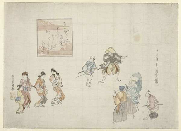 Curator: The artwork before us is a piece from the Kano School, titled "Procession of the Emperor and Suite," dating back to 1626. Crafted with ink, colored pencil, and watercolor on paper, it offers a glimpse into a regal procession. Editor: It feels so light and ephemeral, doesn’t it? Like a dream fading at the edges. The figures almost float on the aged paper, and it's clear that narrative takes center stage above detail. Curator: Precisely. The use of these mediums evokes the Yamato-e tradition with a nod towards the aesthetics of Ukiyo-e in its rendering of everyday life, or at least courtly life, wouldn't you say? The formal composition, albeit asymmetrical, really guides your eye across the scene. Note how line and minimal color contribute to an overall sense of movement. Editor: I find myself pondering about the unsaid things – the air between the figures. It strikes me that with each step, both those visible and unseen create a tapestry of the power dynamics. There is a palpable distance despite them all journeying together in this 'procession'. Or am I merely projecting emotional subtleties where the intention of the piece is largely presentational? Curator: Not at all; that palpable tension contributes much to its mystique and could quite well reflect reality. You are right, though – the use of minimal detail, is remarkable – allowing negative space to imply grandeur rather than explicitly depicting it. The artist invites you to construct the narrative – it asks more questions than it answers. Editor: Yes! Which probably means my musings are welcome after all. This conversation we’re having… isn’t this the real point of experiencing a work of art? Curator: Maybe. Now, I feel it is drawing us into something so timeless about hierarchy. What do you think of this after this little viewing session we just had? Editor: I see an illustration that shows, and asks so much more. There is power in quiet suggestion instead of verbose narration, the most important thing. I want to find all the questions this prompts for everyone else.