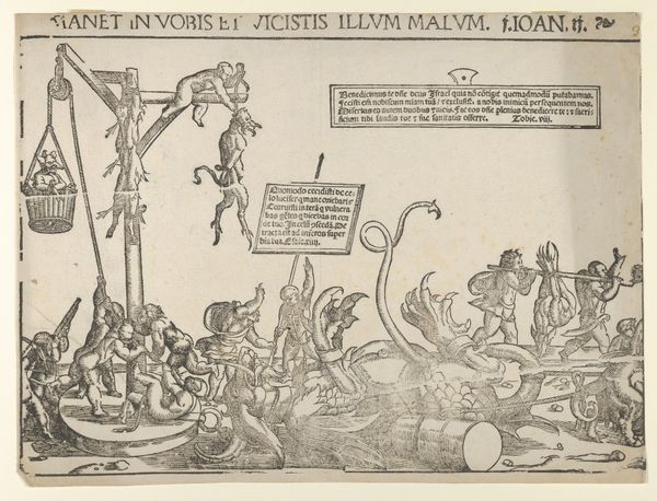 Editor: This etching, *Kinderkruistocht* by Monogrammist LIW, possibly created between 1522 and 1800, feels chaotic. There's so much happening, with bodies and strange creatures. The line work is incredibly detailed, but the meaning is escaping me. How do you interpret this work, considering its dense imagery and historical context? Curator: Look closely at how the artist utilizes the printing press, a relatively new technology at the time, to disseminate potent visual propaganda. The "children’s crusade" motif is particularly interesting here. Consider who the consumers of these images were. Was this artwork intended for popular consumption, perhaps as a cheap and reproducible commentary on societal woes? Or was its intended market a more affluent, educated class with an interest in allegory and moral instruction? Editor: That's a fascinating point. So, the value isn’t necessarily in the individual artistic skill, but in its potential for mass distribution and social commentary. Were prints like this a common form of media critiquing power structures at the time? Curator: Precisely. Think about the socio-economic conditions under which this print was made. Religious and political upheaval was prevalent, leading to a hunger for easily accessible narratives that commented on corruption and power. The relative affordability of prints made social commentary accessible to a wider audience than paintings did, right? Editor: Yes, that makes a lot of sense. It seems the material itself, the printed image, facilitated a new way to engage with potentially controversial ideas. Curator: Exactly. The medium is the message. Editor: This gives me a whole new appreciation for printmaking beyond just aesthetic value. I am thinking more deeply about the art's social role now. Curator: Indeed. Analyzing the means of production can unlock profound insights into the historical context and intended audience.