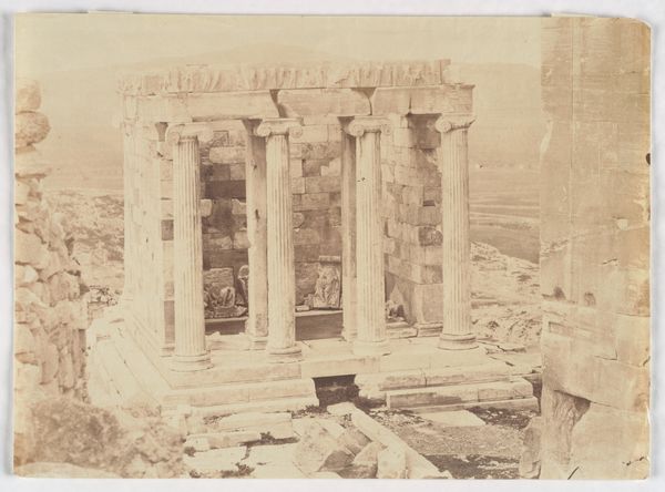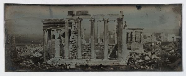 Editor: This is a daguerreotype by James Robertson, taken between 1850 and 1855, capturing the Acropolis in Athens. It feels monumental and somehow desolate. What are your initial thoughts? Curator: Well, focusing on materiality, it’s crucial to understand the daguerreotype as an object, a copper plate made photosensitive through a chemical process, developed with mercury vapor. In the mid-19th century, capturing an image of this scale and detail demanded immense skill and specialized labor. Think of the journey to Athens, the transport of equipment, the processing – a global network fueled by colonial power dynamics to document these sites. Editor: That’s fascinating. It completely changes how I see it. So, it's not just about the artistry but about the means to even create this image. The socio-economic conditions become part of the picture itself, literally! Curator: Precisely! Consider the materials themselves: Where did the silver come from? Who mined it? And who processed it? These "details" expose the networks of labor, the exploitation embedded within the act of documentation. It asks us to question whose vision this truly represents – the photographer, the patron, or the system that enabled its production. Editor: So the decay evident in the Acropolis' stones is mirrored by, maybe even inseparable from, the historical "decay" of those who made its imaging possible. Is it possible to look past these colonial-era questions when approaching artwork like this? Curator: No, not if we're engaging critically with the object. Understanding these networks is not about assigning blame, but recognizing the interconnectedness of history, labor, and artistic creation. Editor: I guess it's a constant negotiation between admiring the final product and acknowledging the context that made it possible. Curator: Absolutely, a materialist approach to art acknowledges that tension and seeks to reveal the hidden stories embedded within the materials themselves. We shift the focus from idealized beauty to the complex, often troubling, realities of production.