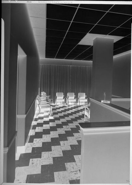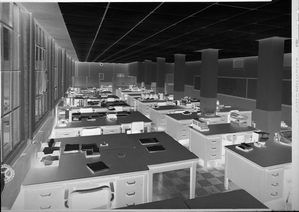 This black and white photograph, by Robert Burian, captures a "large office." It’s made with traditional photographic materials – film, chemicals, and paper. But the real subject here is the modern office itself, as a machine for labor. The material language of the space speaks volumes: repetitive desks, each equipped with the tools of bureaucracy. The uniform surfaces and functional design suggest efficiency, but also a certain dehumanization. Look at how the desks are arranged – a regimented grid that implies control and surveillance. The floor is similarly marked out in a bold geometric pattern. Burian's photograph is a study in how design can shape behavior and reinforce social structures. It invites us to consider the labor, politics, and even the consumption that go into creating and maintaining such a space. Ultimately, this image is a potent reminder that the built environment is never neutral; it’s always charged with meaning and intent.