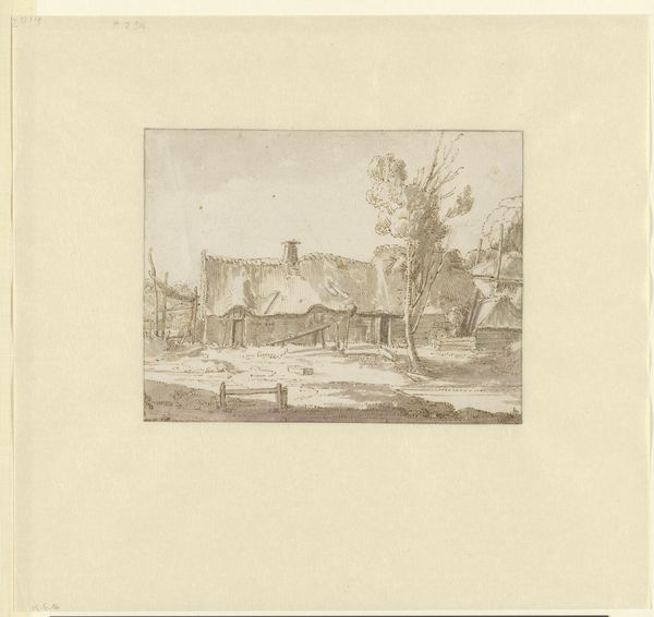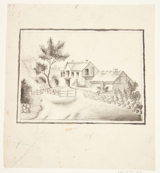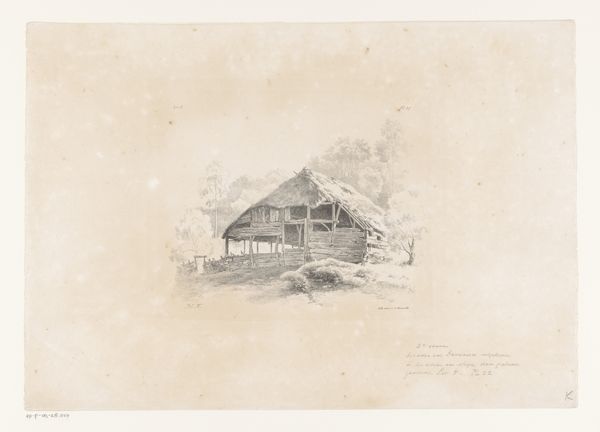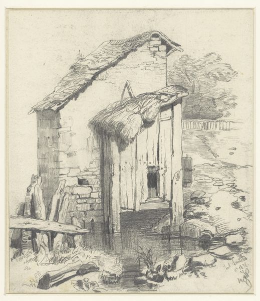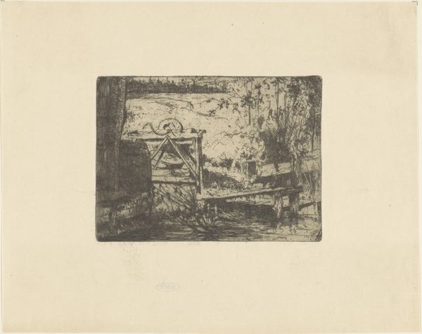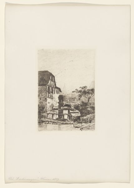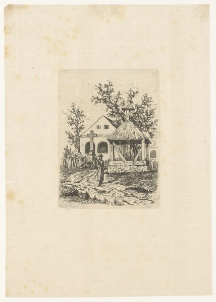 Maria van Hohenzollern-Sigmaringen created this etching, "Wooden House with Fountain," with remarkable precision in lines and structure. The composition, with its stark contrasts and delicate hatching, invites us to consider the semiotic elements at play. The geometrical layout – the sharp angles of the house against the softer, organic shapes of the landscape – introduces a dialectic between the built environment and nature. Vertical lines of the wooden construction contrast with the horizontal layers of the stone fountain, which serves as a mediator between artifice and nature. This suggests a narrative around human intervention in the natural world. The graphic structure of the work challenges any romantic reading of the landscape. The way the artist uses the etching technique, scratching away to reveal depth and texture, evokes a feeling of stark realism, even of alienation. This formal approach emphasizes not just what is depicted but how it is constructed, reminding us that the image is always a carefully mediated representation of reality.