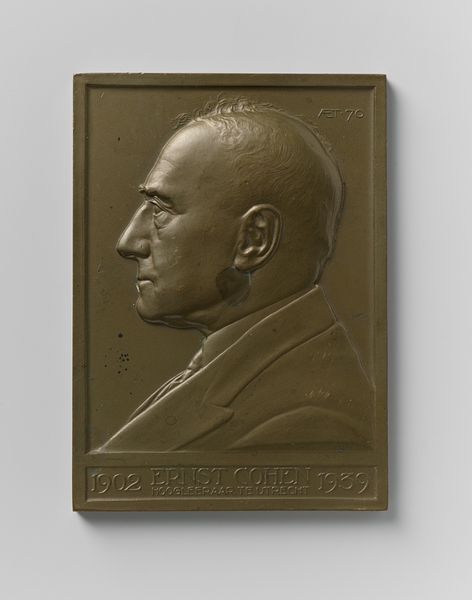 Editor: Here we have the bronze relief, "Plaquette met portret Chr. Oudemans" created in 1898 by Johan Melchior Faddegon. It’s a portrait of a man in profile... the relief medium gives it such a stoic, almost imposing quality. What do you see in this piece, especially considering its historical context? Curator: It’s fascinating how portraiture, especially in this academic style, often served to reinforce existing power structures. Oudemans, judging from his attire and the formal inscription, was likely a figure of authority, and this plaque functions as a sort of commemorative object. Who was he memorializing? And what values was the artist embedding in this representation? Consider the gaze: averted, seemingly contemplative, reinforcing a kind of learned authority. What social role do you think this piece was designed to play? Editor: It definitely seems to be emphasizing his authority and intelligence. Perhaps it was meant to be displayed in a university or institution where he was affiliated? Do you think the bronze medium adds to that sense of authority? Curator: Absolutely. Bronze carries historical weight, connecting back to classical traditions of honoring important figures. Think about who had access to commissioning such works at the time and what statements those commissions made about their place in society. Did it perpetuate elitism? In what ways did it also democratize certain stories? These questions help us to challenge how history is represented, who is remembered, and who is often left out of these narratives. Editor: I see what you mean. The choice of bronze, the formal style—it all points to a deliberate construction of Oudemans’ image as an important, respected figure, perhaps more about the artist's values. Thank you; I hadn't considered how much portraiture could reinforce power dynamics. Curator: Examining those dynamics is crucial, and considering art in that context opens up so many important questions.
