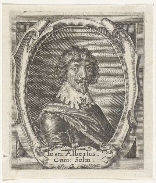 This print of the appointed Prince Christian was made by Simon de Pas around 1642. Notice first the oval frame, which focuses our attention directly on the Prince, whose gaze meets ours head-on. The composition balances formality and detail. De Pas uses contrasting textures, from the smooth face to the intricate lace collar and patterned fabric, to create visual interest. Linear patterns define the background, yet this gives way to the rich textures of the Prince's attire, emphasizing his status. Consider the semiotic implications of such a formal rendering. The Prince is presented through very controlled lines, with careful consideration given to the placement of elements within the frame. De Pas employs a system of signs that encode power, status, and dynastic continuity. The meticulous detail and controlled composition suggest a carefully constructed image, not just of a person, but of an ideal.