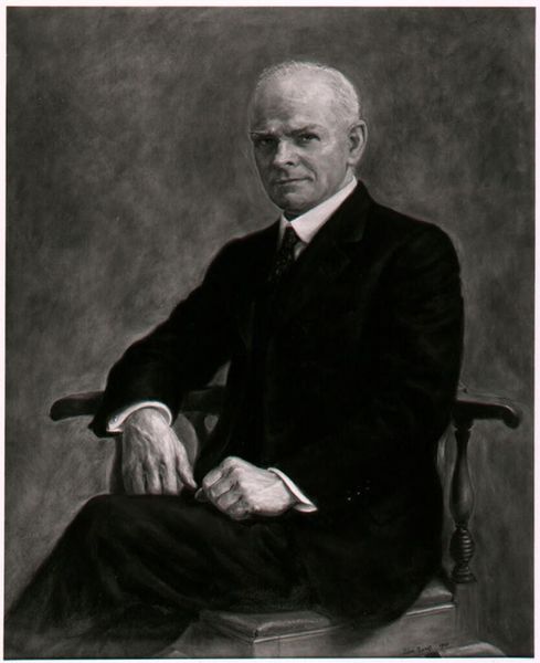 Editor: This is an undated photograph by Jean Raeburn, titled "Untitled (man in suit with cigarette)." The stark contrast between light and shadow gives it a real sense of depth. What do you see in this portrait? Curator: The formal composition directs our attention immediately to the sitter's gaze, engaging us. Note how the geometric backdrop, while blurred, provides a structural counterpoint to the organic form of the figure. Editor: So, the background isn't just background; it's actively contributing to the overall form? Curator: Precisely. The interplay between the sitter's pose and the backdrop's abstract shapes creates a balanced, almost architectural, quality. Consider also the diagonal line of the tie and its impact. Editor: I see. It's not just a portrait; it's a study in form and composition. Curator: Indeed. By analyzing these elements, we gain a richer understanding of the artist's intent and the artwork's inherent qualities.