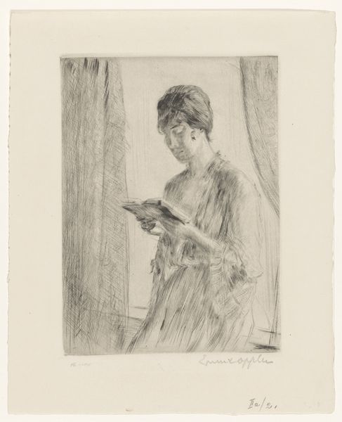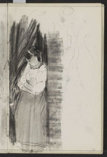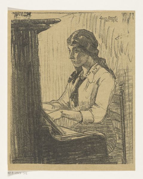 Curator: This is Carel Adolph Lion Cachet's "Studie van de echtgenote van Carel Adolph Lion Cachet, handwerkend," placing us somewhere between 1874 and 1945. A study rendered in ink. Editor: My initial response is drawn to the stark simplicity and the pervasive feeling of domestic quietude. There's an intimacy here, an almost voyeuristic peek into a private moment. Curator: Indeed. The artist’s approach focuses on line quality above all. The density of strokes defines form, creates value. Consider how he differentiates planes through cross-hatching alone, manipulating the void and solid expertly. Editor: Absolutely, and beyond the immediate visual dynamics, the act of handwork itself—the needle and thread—carries potent symbolism. Historically, such labor represented feminine virtue, patience, and domestic stability. Curator: It becomes a kind of cipher then. We read this composition of densely applied strokes almost like code, with line, weight and orientation standing for larger representational themes and ideas about gender roles and labour. Editor: Precisely! It’s more than just depicting a woman sewing. The very act is imbued with the cultural weight of expectations placed upon women within that era. Curator: There's a wonderful tension too. The dynamism of the mark-making set against the stillness of the subject in her activity, generating an enduring intrigue that arrests the gaze. Editor: This interplay you note really encourages a contemplation about the symbolism ingrained into even our seemingly most quiet domestic acts. A subtle testament to the enduring power of ordinary gestures. Curator: By parsing that, by attending closely to form, we may also appreciate its role in the historical representation of women in genre painting, where figures like the sitter are posed, caught in quiet domestic tableaus, framed against an array of interior signifiers. Editor: What at first seems to be an intimate study quietly reverberates with socio-historical complexities. Thank you for illuminating that interplay for me! Curator: It’s been enlightening to unpack these rich details. I appreciate you inviting an unpacking of its more subtle intimations.