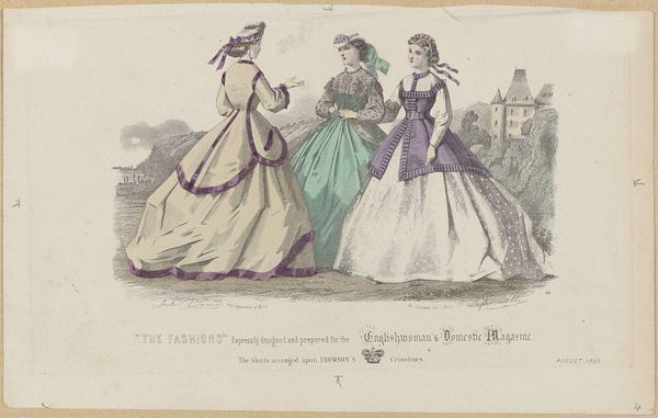Florensa de Closménil made this hand-colored etching, entitled ‘La Mode,’ in France, September 25, 1846. It depicts women's fashion and touches on gender roles in the mid-19th century. Fashion plates such as this one were common in France during this time and served as a tool to communicate to the upper and middle classes what was considered en vogue. This etching provides insight into the social and cultural values of the period. The dresses, bonnets, and hairstyles represent the idealized feminine appearance, while the poses and interactions between the figures suggest the social etiquette and norms of the time. The artist is offering a critique of gender hierarchies and the restrictive roles imposed on women in 19th-century French society. The image seems to suggest the absurdity of the strict social structures of the time. To understand this etching better, we could consult primary sources, such as fashion magazines and etiquette guides from the 1840s. Scholarly articles on the history of fashion and gender roles in 19th-century France could also be illuminating.