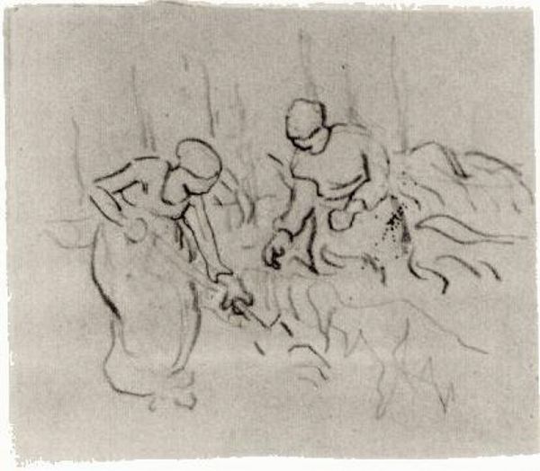 Curator: Here we have Vincent van Gogh's 1890 drawing, "A Group of Figures on the Beach." It’s a pencil and ink sketch that captures a bustling seaside scene. Editor: My first impression is one of frenetic energy. The loose lines and sketch-like quality almost give it a feeling of constant motion. Curator: That's astute. This drawing comes from a period where Van Gogh was exploring themes of labor and daily life, even while grappling with his own internal turmoil. You can see this reflected in the somewhat anxious energy of the strokes. Coastal communities, of course, have been documented, aestheticized, and even romanticized. How does the social history intersect with its formalism? Editor: Formally, there’s a tension between the static group on the shore and the turbulent sea. Van Gogh’s lines vary greatly – some are confident and defined while others are much lighter, adding to the feeling of instability, and a sense of dynamism across the landscape. There is this dramatic effect of implied action through visual suggestion alone. Curator: Absolutely. This beach wasn't just a vacation spot. Fishing and seafaring communities were integral to the region's economy and social fabric. Van Gogh often depicted workers and the working class; portraying ordinary people within their environment was, for him, very much a deliberate, democratizing act. But do the lines convey social realism? Editor: In his rendering, the people are de-individualized through generalized outlines. What’s prominent here isn't specific identities, but, instead, social energies. Van Gogh does show the people's collective identity through rhythmic pattern. Curator: Indeed. While it doesn’t have the striking color of his paintings, this sketch reveals how Van Gogh was equally adept at capturing movement and mood with line work alone. His sensitivity and investment toward subject shines clearly. Editor: Exactly. Seeing how the composition conveys emotion, even in such a simple medium, gives an immediate insight into the core essence of what made Van Gogh’s artistic vision so potent.