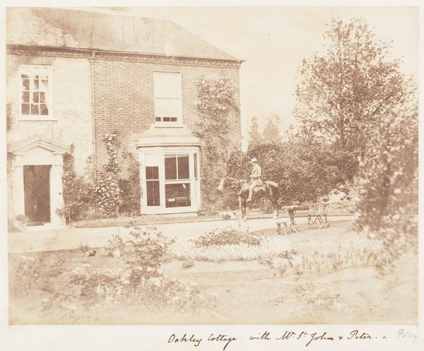 Curator: This is "A Very Pretty House," a photograph taken by James Knight between 1853 and 1856. It is currently part of the Metropolitan Museum of Art's collection. Editor: My first impression is how wonderfully quaint and idyllic it feels. It almost seems pulled from a storybook. The sepia tones certainly add to that vintage aesthetic. Curator: Indeed. Let's consider the process here. Knight's work sits interestingly in the context of early photography; a medium finding its feet both as a tool for documentation, and an artistic method in its own right. You see an evident aesthetic ambition; the composition isn't merely a snapshot. Editor: Exactly. And look at how this kind of subject matter becomes fashionable! This romantic, pastoral imagery directly participates in a widespread yearning for simpler times and rural life that resonates throughout the art world in the mid-19th century. You even see echoes of the Hudson River School's landscape painting influence. Curator: Interesting. And thinking about how it might have been received in exhibitions at the time, what power might its display held? Photography was starting to infiltrate art institutions and public consciousness. Editor: Absolutely. Showcasing photography like this, picturing the ‘everyday’, helped elevate photography and create dialogues about it and how the industrial boom can relate to simpler days in the countrysides, creating almost propaganda to bring forward different forms of art expression in our day to day! Curator: This image and many like it played a part in that struggle. Knight, through careful attention to detail, material conditions and process, demonstrates the artistry of this medium. And this one "Very Pretty House" acts almost as an artefact of all this. Editor: In thinking about Knight's goal of documenting "A Very Pretty House," its very ordinariness emphasizes how such photographs legitimize new subject material worthy of display and public discussion. It challenges pre-conceptions and becomes something more. Curator: Very much so. A single house, carefully shot, reframing debates around photographic artistry and societal values in early Victorian culture. Editor: Yes, seeing how even ‘A Very Pretty House’ helped pave the way for so much cultural re-evaluation is fascinating.