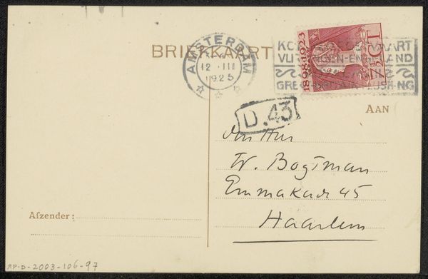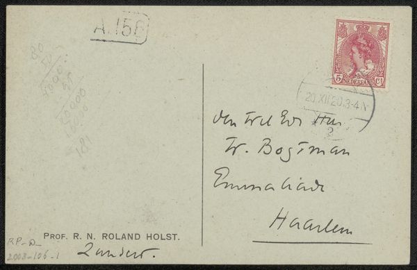 This postcard was addressed to Frans ter Gast by Albert Roelofs. The pale green of the card is overlaid with information, handwriting and stamps. The stamps in the upper right corner, two identical squares, each feature a bold, centered numeral ‘1.’ I find myself drawn to the casual, slightly hurried script. The ink varies in darkness, suggesting pauses, changes in pressure. See how the letters sometimes loop elegantly and other times are cut short? The way the ink bleeds slightly into the paper gives it a tactile quality. You can almost feel the nib of the pen pressing into the surface. Look at the word ‘Belg. Park’ in the lower left corner, the letters are packed closely together, almost touching, as if the writer was running out of room, or maybe just felt like squeezing them in. There’s a kind of awkward beauty in that. The whole thing feels immediate and human. It makes me think of Cy Twombly, who was a kindred spirit, finding poetry in the everyday, elevating the humble gesture to something profound. Art really is just an ongoing conversation.