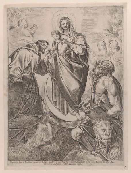 Curator: I find myself immediately captivated by the stark contrasts, the almost ethereal glow emanating from the figure of Veronica. It's a baroque print, created sometime between 1628 and 1689, and is titled "H. Veronica." The work is attributed to Alexander Voet, I. What strikes you first? Editor: The palpable sadness. The downturned eyes, the glistening tears—Veronica's grief practically leaps off the surface. And then, this unsettling mirroring of suffering between her face and the image on the cloth she holds. Is this even supposed to be... pleasant to look at? Curator: Pleasant is perhaps not the artist's intention here. The linear precision afforded by the engraving process renders every minute detail with exacting clarity, focusing our attention on the narrative. Observe how Veronica is illuminated from within, bathed in light. The luminosity surrounding her head emphasizes her saintly status, imbuing the scene with profound significance. Editor: You're right, of course. The rendering of light is pretty stunning. But all those meticulous lines… the prickly crown of thorns... they give it such a somber, almost obsessive feel. The image, though small, packs this emotionally loaded, melancholic punch. The material she's holding–the Veil, it just amplifies everything with its stark reality. And what I feel like she’s facing is nothing less than devastating. Curator: The historical and religious context undoubtedly colors our reading of the print. The image captured on the veil symbolizes both profound suffering and miraculous intervention. Consider the artist's mastery in evoking not only the physical likeness but also the profound spiritual weight carried within this single, powerful image. Its composition elevates it beyond mere portraiture to history-painting. Editor: True. Despite its seemingly simple presentation, Voet conjures up an entire world of pain and wonder through pure visual storytelling. The work transforms, even in reproduction, to some relic or symbol. Curator: Precisely. "H. Veronica," through its formal elements, compels a sustained contemplation on faith, suffering, and artistic representation itself. It has certainly offered some clarity on the power of printed devotional imagery in the Baroque era, wouldn't you agree? Editor: It definitely leaves one with something, yeah. It feels as though something real and profound has passed right through the paper... almost like the veil itself.