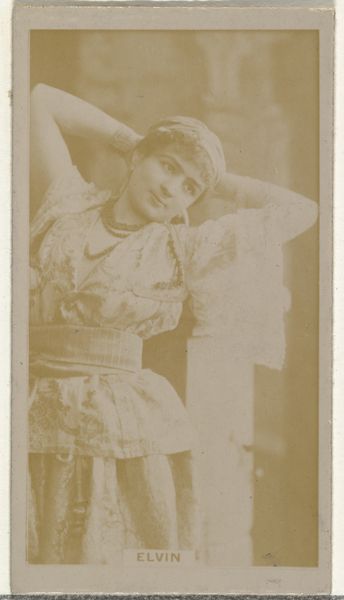 Curator: There’s a certain melancholic stillness to this print. It reminds me of faded photographs discovered in an old family album. Editor: This is "Trix Fricanza," a print dating from around 1890 to 1895, part of the Actors and Actresses series issued by Duke Sons & Co. as a cigarette card. It employs a combination of drawing and photography. Let’s dive into its materiality. These cards were designed to stiffen cigarette packs, but they quickly evolved into collectible items. Curator: Knowing its intended purpose, I'm drawn to the construction of celebrity and the performance of femininity that it represents. Note the carefully staged pose – the languid lean, the elaborate gown… It speaks volumes about the prescribed roles for women in the late 19th century and the burgeoning culture of celebrity. This wasn't just about selling cigarettes, but selling an image. Editor: Precisely! The means of production become critical here. Cheap paper, mass-produced prints… it democratized art in a way, making these images of actors and actresses accessible to the masses. However, that accessibility came at the cost of labor—consider the factory workers churning these out by the thousands. Curator: The cultural impact is undeniable. These cards circulated widely, shaping public perceptions of beauty, talent, and success. The gaze is constructed here—who is Trix looking at, who is consuming her image? This speaks to much broader discussions around agency and the male gaze. Editor: Absolutely. The material itself reveals layers of economic and social relationships that we can analyze to deconstruct dominant narratives of high art. Each cigarette card is an artifact loaded with social information about labor, consumption, and early marketing tactics. The subtle gradations, are these coloured pencils as the AI-tag claims? Curator: Exactly. The subject embodies that ideal of feminine beauty within constraints of her time, the visual is in dialogue with cultural narratives that continue to affect discussions about body image, beauty standards, and fame today. Editor: Looking at this small piece, I’m reminded of the power in scrutinizing seemingly simple, everyday objects to understand larger socioeconomic forces. Curator: I find myself contemplating what it means to preserve these transient objects and, in doing so, challenge canonical narratives of art history to accommodate overlooked contributions and perspectives.