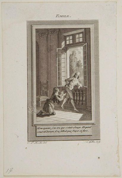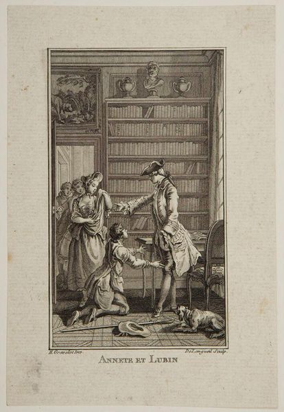 Curator: This engraving by Jean Nicolas Adam, titled "Turning her head slightly, with a simple gesture she pointed her finger at the rug at her feet," presents an intriguing scene. Editor: It feels performative, doesn’t it? The man kneeling, the woman's dismissive gesture… There's a power dynamic at play here that feels very deliberate. Curator: Absolutely. Consider the context of the Confessions of Jean-Jacques Rousseau, from which this image originates. The scene illustrates a moment of rejection or perhaps manipulation within the narrative. Editor: And how that plays out visually! Her controlled posture versus his theatrical pleading speaks volumes about societal expectations and gendered roles in that era. Curator: Precisely. The composition, with the woman near the light and the man cast in shadow, reinforces her position of authority. Editor: It's a potent image, sparking thoughts about the complexities of desire, control, and the performative aspects of social interaction. Curator: Indeed, and situating it within the framework of Rousseau's Confessions allows us to delve into the cultural and historical context of its creation.