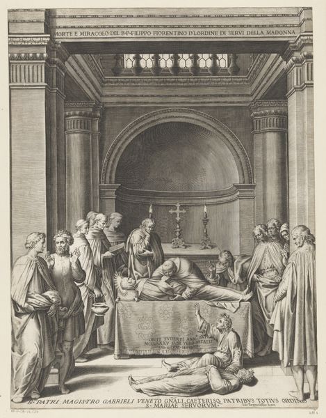 Curator: My word, isn't this engraving utterly captivating? "Tu Marcellus Eris," created by Charles Simon Pradier in 1832, it’s just steeped in classical drama. The neoclassical style fairly leaps off the page, wouldn't you say? Editor: It's certainly…stark. Almost oppressive, even with the clear, academic lines. It gives off this powerful feeling of impending doom, and this really reflects what it represents. Marcellus' death and Augustus' grief is palpable here. Is that what the title alludes to? Virgil's prophesy about Marcellus' doomed fate? Curator: Precisely. Virgil’s line, "Thou shalt be Marcellus," from the Aeneid. The engraving, housed here at the Metropolitan Museum of Art, perfectly captures the moment. I find it almost heartbreaking. Do you notice the dramatic light? Editor: The chiaroscuro is strong. I also love how the setting really emphasizes imperial power: we're in a grand interior with strong vertical lines that focus the scene; everything feels solid and impenetrable. A naked, warrior statue standing guard with a drawn sword adds to the ambiance. Curator: Oh, yes, the warrior sculpture looms over everything. But look at the faces—the artist’s skillful hand at depicting the despair, especially the women and the elders witnessing such a tragic demise. There's something undeniably beautiful about the scene, even in its sorrow. Pradier, you know, was excellent. I really love that line. Editor: Right. In light of Pradier and the context of its creation, perhaps what strikes me the most is how historical narratives get solidified into what feels like inescapable truths—in part, precisely because of beautifully-wrought artworks such as these. There's power in memorialization; and responsibility, too. Curator: I couldn't agree more. It leaves you contemplating the nature of fate, doesn't it? And mortality! It seems to float between capturing beauty and truth. That combination is quite evocative. Editor: It truly does, and by emphasizing this specific telling, other versions fade, while sociopolitical norms consolidate. It definitely invites thoughtful contemplation about more than just a single death. Thanks for shedding some light on this powerful and somewhat foreboding image.