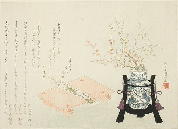 Keisai Eisen crafted this woodblock print, "Cards, Fukujuso Flowers and Screen," sometime in the 19th century. At first glance, the composition reveals a studied arrangement of objects, each rendered with meticulous detail and a muted color palette. Eisen focuses on the spatial relationships between the objects, arranging them in layers to create depth. The Fukujuso flowers symbolize good fortune, sitting atop a stark black stand, offset by a backdrop of a delicately framed screen. The book of cards draws the eye downward, their edges softened by a scattered pile of rectangular paper slips. The scene invites us to explore the formal qualities of the artwork and the cultural codes they represent. Eisen's composition destabilizes conventional modes of representation by collapsing foreground and background, object and symbol. The print doesn't merely depict a scene, it invites a semiotic reading where each element functions as a signifier within a complex web of cultural and philosophical meanings. The texture and composition create a symbolic space, inviting ongoing interpretations.