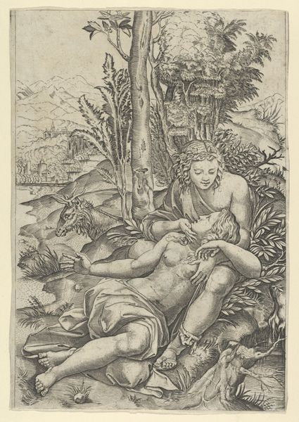 Editor: This is "Vertumnus and Pomona," an engraving by Jan Saenredam from after 1605, currently at the Minneapolis Institute of Art. The detail is amazing. What strikes me is the contrast between the youthful nude and the cloaked, older figure. What can you tell me about this piece? Curator: It's a beautiful rendition of the Roman myth. See how the landscape is almost overflowing with bounty? Every detail from the fruits to the vegetables, to the figures themselves, carries meaning. Editor: Meaning like...? Curator: Like how Vertumnus, the god of seasons and change, disguises himself as an old woman to woo Pomona, the goddess of fruitful abundance. The disguise itself symbolizes transformation and deception, powerful themes explored across art history. What emotional weight does the contrast in their ages suggest to you? Editor: Maybe that love and desire are universal, not limited by age or appearance. There's a vulnerability in Pomona's gaze that hints at a deeper connection. Curator: Precisely. The symbolism is echoed in the ripe, almost bursting fruits; a visual metaphor for fertility and the promise of fruition. This visual language connects back to earlier artistic traditions of gardens as sites of love, union, and temptation. Editor: So it's more than just a pretty picture. It is filled with multiple layers of symbolism. Curator: Absolutely! This image speaks volumes about desire, transformation, and the cyclical nature of life, echoing cultural memory through visual form. It is interesting that even now we continue to re-tell the stories in the myths. Editor: It's amazing how much information is packed into one scene. I'll definitely be looking at art differently now, searching for those layers of symbolism. Curator: Exactly. Understanding the symbols allows the viewer to enter a timeless narrative.