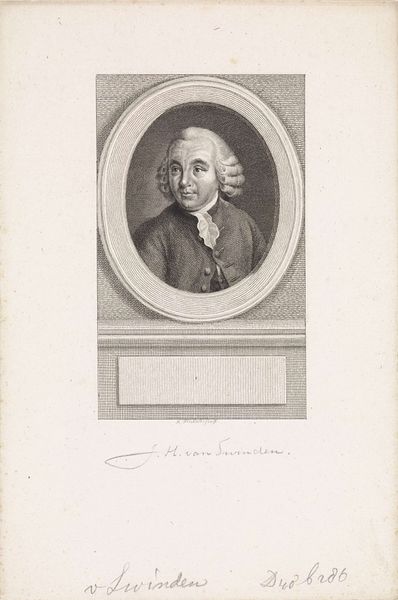 Curator: Good morning! Let's dive into this captivating portrait. Editor: Indeed. This is a print from somewhere between 1786 and 1809 entitled "Portret van Paulus Gevers," created by Reinier Vinkeles, residing in the Rijksmuseum's collection. The artist worked with graphite and engraving. There's something very formal, even severe, about the way he's presented within this very structured oval. What strikes you most about it? Curator: Well, placing this portrait within its historical context is essential. Notice the Neoclassical style, evident in the clean lines and the almost Roman-like austerity? This wasn't just about aesthetics; it reflected the Enlightenment values of reason and order, which were gaining momentum at the time. Consider how these values affected society, particularly those who occupied positions of power and wished to express such status through the arts. Does that formality you observe possibly convey an intentional message about the sitter's status and ideals? Editor: I hadn't considered it that way, but now that you mention it, the severe frame within a frame adds to the feeling of formality. So you are suggesting that Neoclassicism in portraiture became almost a tool to shape perception? Curator: Precisely! It was a way for individuals to align themselves with specific intellectual and political movements. Museums and galleries of the time were instrumental in promoting such imagery and shaping public opinion about ideal leaders and citizens. How do you think portraits like these contributed to building the image of individuals during this transformative period? Editor: That makes perfect sense. So it's not just about likeness, it's about constructing an identity and solidifying a socio-political position. Thanks, that adds a whole new layer to my understanding. Curator: You’re welcome. Considering the historical context truly enriches how we see the artwork!