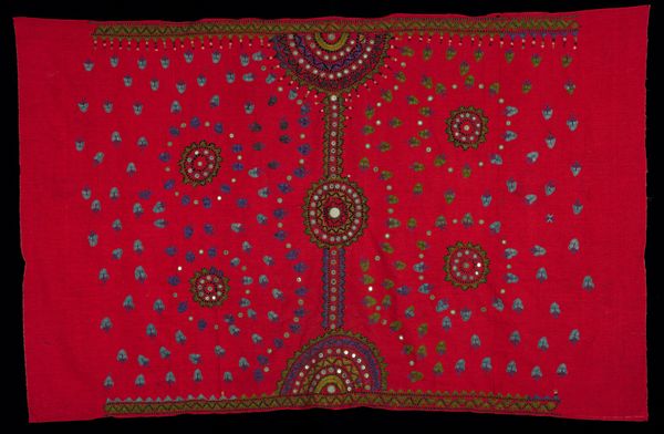 Curator: This textile, called "Woman's Veil (Odhani)", is likely from the 20th century and currently resides here at the Minneapolis Institute of Art. It’s cotton, featuring a resist-dye technique. Editor: Immediately, I see a dark, almost somber field punctuated by these tiny, bright teardrop shapes, like stars in a night sky. The fiery border provides a visual containment to an otherwise infinite pattern. Curator: "Resist-dye" is key here. Imagine the meticulous labor involved—carefully binding sections of the cloth to prevent dye penetration, creating that repeating pattern. It speaks volumes about the cultural value placed on adornment and the skilled labor of women artisans. Editor: Absolutely. Formally, that repeated teardrop motif against the dark ground creates a mesmerizing optical effect, drawing the eye into the center, but also outwards, mirroring the veil’s dimensions and, perhaps, the face of the wearer? Curator: And the veil itself isn't merely decorative. It signals social status, religious affiliation, even regional identity. The choice of dyes, readily available natural pigments, also connects the object to a specific geographic location and trading networks. It's a testament to resourcefulness! Editor: Yes, the muted color palette reinforces this earthy connection. However, if we consider its aesthetic composition, the border becomes a structural framing device and isolates that contained field, emphasizing pattern. It transcends utilitarian value. Curator: To push back a bit, even the notion of “transcending” its utilitarian function speaks to a hierarchy. These aren't just objects of beauty; they're integral components of everyday life, tied to gendered roles and economic systems. The materiality informs those readings. Editor: Point taken, but can't it be both? The eye, through a language of line and shape, sees beauty even as the hands discern function. It is an elegant design with compelling chromatic contrast of bright against dim. Curator: Precisely, it's a confluence of purpose and artistry. Recognizing that intersection helps us appreciate not only the finished product but the labor and context informing its creation. Editor: I leave with a richer view by noticing details that can make visual elements emotionally resonant while considering its purpose within society. Curator: Likewise, I am newly attentive to both form and social history that weave the full complexity of this modest, yet rich, object.