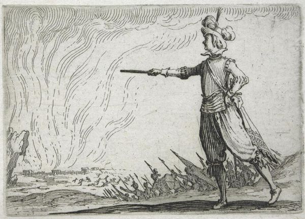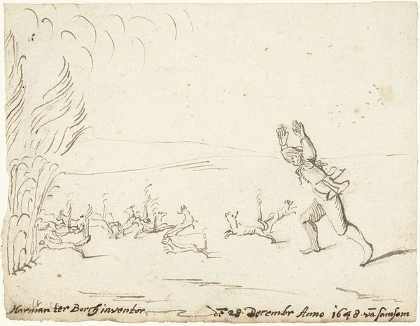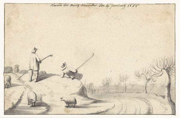 Harmen ter Borch sketched "Two Herders Driving Their Sheep" in 1649 using pen and brown ink. This pastoral scene offers a glimpse into the rural life of the Dutch Golden Age. During this era, the Netherlands experienced significant economic growth and social change, which fueled interest in genre scenes depicting everyday life. Ter Borch’s drawing captures the movement of the herders and their flock. The figures, rendered with quick, expressive lines, convey a sense of urgency. There’s a dynamic contrast between the herders, actively guiding their sheep, and the sheep, which are grazing peacefully. This work reflects the period's complex relationship with nature. While the herders appear to be in charge, nature is a reminder of the reliance on land and labor. Ter Borch's sketch invites us to reflect on the labor, social hierarchy, and the intricate connections between people and the natural world.