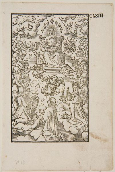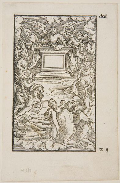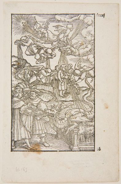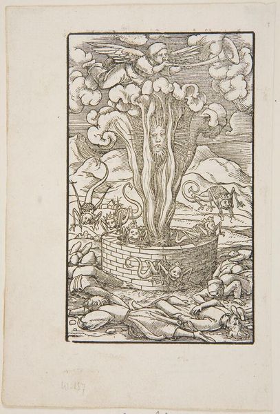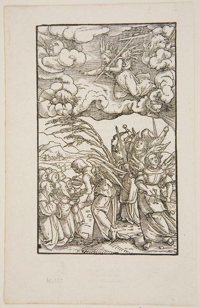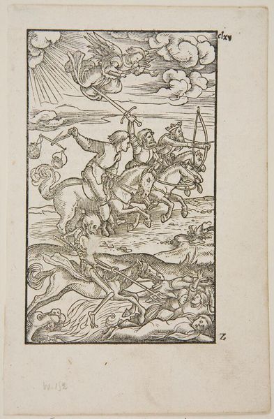 Editor: This woodcut, "The four angels causing death and destruction (the sixth angel)," by Hans Holbein the Younger, is incredibly striking! It's teeming with figures and energy. What do you see in this piece, in terms of its historical context? Curator: I see a visual representation of the anxieties and religious fervor of the Reformation era. Holbein, working in a time of immense social and religious upheaval, uses the imagery of the Apocalypse to critique power structures. Note how the figures of authority cower amidst the chaos. Editor: So, it's not just a religious scene; it's a commentary? Curator: Exactly! The print becomes a potent tool for social commentary, reflecting the anxieties around religious authority and the questioning of established norms. The scale of the destruction is symbolic of the era's turmoil. Editor: I never thought about it that way. Thanks! Curator: My pleasure! It is always fascinating to see how art captures the intersection of culture, religion, and power.