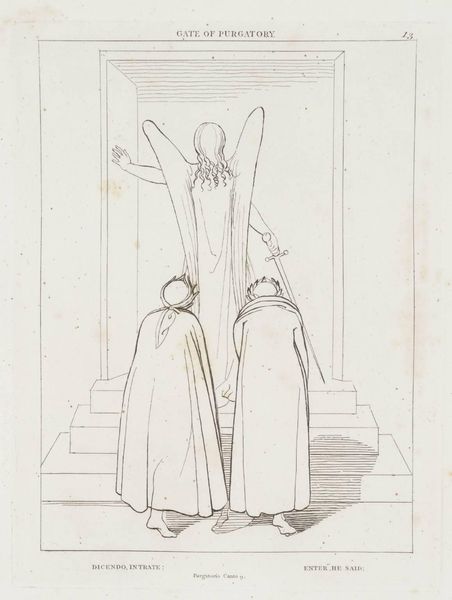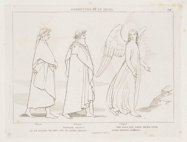 Curator: This is John Flaxman's "The Salutation," currently residing in the Tate Collections. Editor: It strikes me as stark, almost aggressively simplified. The lines are so thin, barely there. Curator: Flaxman was known for his neoclassical style, a reaction against the ornate baroque. He emphasizes line over color, reducing form to its most essential. What about the means of production? Editor: Well, the printmaking process allowed for wide dissemination of these images, influencing public taste and religious sentiment on a broad scale. It democratized art. Curator: Indeed. The materiality of the print itself, the cheap paper, the easily reproducible lines, speaks to a desire for accessibility. How interesting, isn't it? Editor: It's true, the medium becomes part of the message, shifting the focus from elite patronage to the everyday consumer. Something to consider.