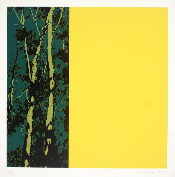 Curator: This striking print by Menashe Kadishman presents a vibrant contrast, with a section featuring trees against a blue background juxtaposed with a bold, yellow field. Editor: The immediate impression is one of duality – a dialogue between nature and abstraction. The yellow feels almost aggressively cheerful next to the shadowed woods. Curator: The juxtaposition here is very interesting when contextualizing it within Kadishman’s larger body of work. His work often grapples with themes of memory and trauma, particularly in relation to the Holocaust and the landscape of Israel. Editor: Absolutely. Yellow can symbolize optimism or warning. Here, it feels like a barrier—or perhaps an imposed hope—standing against the implied depth and potential darkness of the forest scene. The trees reach upwards, yet the bright field hems them in. Curator: I agree. It is a stark contrast in both color and subject. Perhaps this artwork is showing us the artist's attempt to reconcile with trauma. Editor: A poignant thought. It reminds us that even seemingly simple images can hold complex emotional and cultural weights.