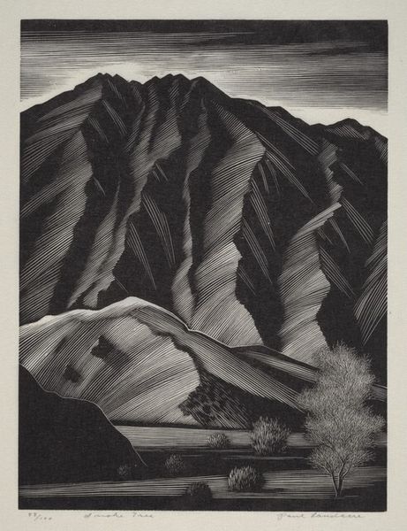 Curator: Marsden Hartley’s 1933 graphite drawing, “Waxenstein,” presents us with a striking, almost architectural interpretation of a mountain range. Editor: It looks formidable, almost brooding, like some ancient, sleeping giant. The textures, the gradations in pencil…it’s surprisingly moving for what is, essentially, a geometric study. Curator: Indeed. Hartley often returned to landscape, particularly mountains, as subjects capable of conveying deeper emotional or spiritual states. He sought out the sublime in nature, but filtered it through a modernist lens. Editor: The starkness gets to me. Not romantic like a Bierstadt. More raw, honest… like the mountains don’t care who’s looking. He almost reduces it to its core essence, just light and shadow playing across stone. Did he spend much time here, do we know? Curator: Hartley spent time in Bavaria in the early 1930s. The political climate was increasingly turbulent, with the rise of National Socialism, which no doubt influenced his perspective during that period. Editor: Right, the year this was made, things were already sliding. Makes me wonder if that starkness is intentional. Those peaks almost seem like defensive fortifications. Curator: That's insightful. Hartley’s landscapes often become infused with the anxieties and observations of their time. Art historians also read the series that it belongs to as deeply rooted to his queer experience in a historical and social environment. The way the mountain takes on different shapes could be referencing multiple and changing perspectives that one develops to cope and fit in into a society. Editor: You know, there’s a lonely beauty in facing something so immovable, so eternal, as those mountains while all the fragile political realities collapse around you. A sort of refuge. A kind of silent strength that mirrors what one must have within to survive it. Curator: And in representing it, Hartley gives us something to hold on to. A landscape, yes, but also a quiet kind of resilience. Editor: Yes! Ultimately, even in charcoal, mountains outlast empires. Curator: Very well said. A final poignant consideration on the art's context. Editor: That will be my meditation for the day! Thank you.