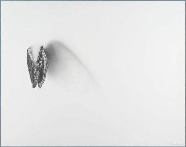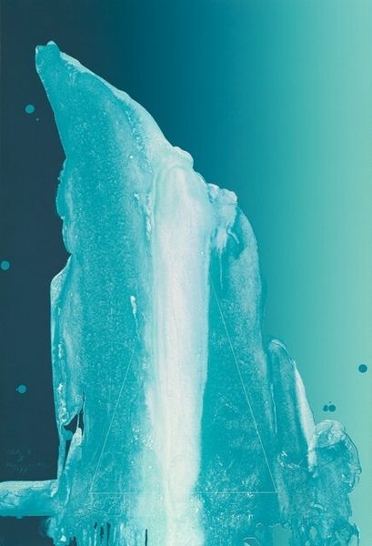 Editor: Here we have "North Wind I," a print from 1977 by Matsumi Kanemitsu. There's an almost icy quality to it. It definitely gives a cold feeling with its dominating blues. What do you make of it? Curator: Oh, Kanemitsu! I always feel like I'm peering into a memory with his works – perhaps one of those vivid childhood dreams where the world isn't quite solid. See how the abstract form looms against that gradiated sky? It’s monumental but also ephemeral. What do you suppose that stark triangle is meant to signify within such a fluid shape? Editor: Maybe it’s supposed to give some structure to the “wind” or the form itself. It reminds me of architectural drawings – a contrast between nature and geometry? Curator: Precisely! Or maybe a reminder that even the wildest, most natural forces can be framed, contained by human perception and design. Don’t you think there is a feeling of incompleteness, a reminder of a past event? Editor: It does feel fragmented now that you mention it. It’s funny, before the triangle felt stark but now I notice it is incomplete and fragile, not assertive. It almost feels as though this artwork poses a question, that the triangle adds this intention to the wind itself. Curator: Beautiful! Every time, art shows you a new face depending on who is seeing it and on when, inviting us into a deeper appreciation and understanding. I feel like it brings out what's been stirring within us.