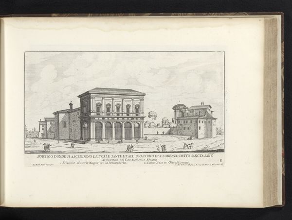 This etching of the Chiesa di Sant'Andrea del Vignola in Rome was created by Giovanni Battista Falda. The composition is structured around a stark contrast of light and shadow. The fine lines delineate architectural details and create depth in the structure of the church and its surroundings. Observe how Falda uses linear perspective to guide the viewer's eye, creating a sense of three-dimensionality on a flat surface. This technique engages with the Renaissance ideals of spatial representation, yet the starkness of the etching also hints at Baroque drama through its dramatic use of light. The contrast emphasizes the clean lines of the building against the open sky, highlighting both the physical form and the symbolic significance of the church within the urban landscape. This etching serves as both documentation and artistic interpretation, capturing the architectural precision and its place within the cultural landscape.